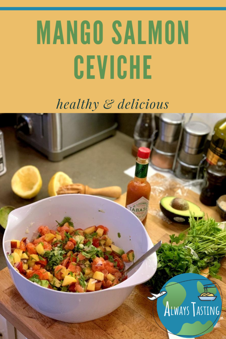 This dish is a favorite in our home. It’s basically a salad with some sort of seafood and a lemon dressing. So easy to make and a versatile way to use up whatever you have left in the fridge. In this recipe, I use salmon and mango which go together amazingly well but you can use the same principle to come up with dozens of different ceviche. It can be a whole meal: filling and satisfying without being too heavy, or as part of a bigger meal as a light refreshing appetizer.